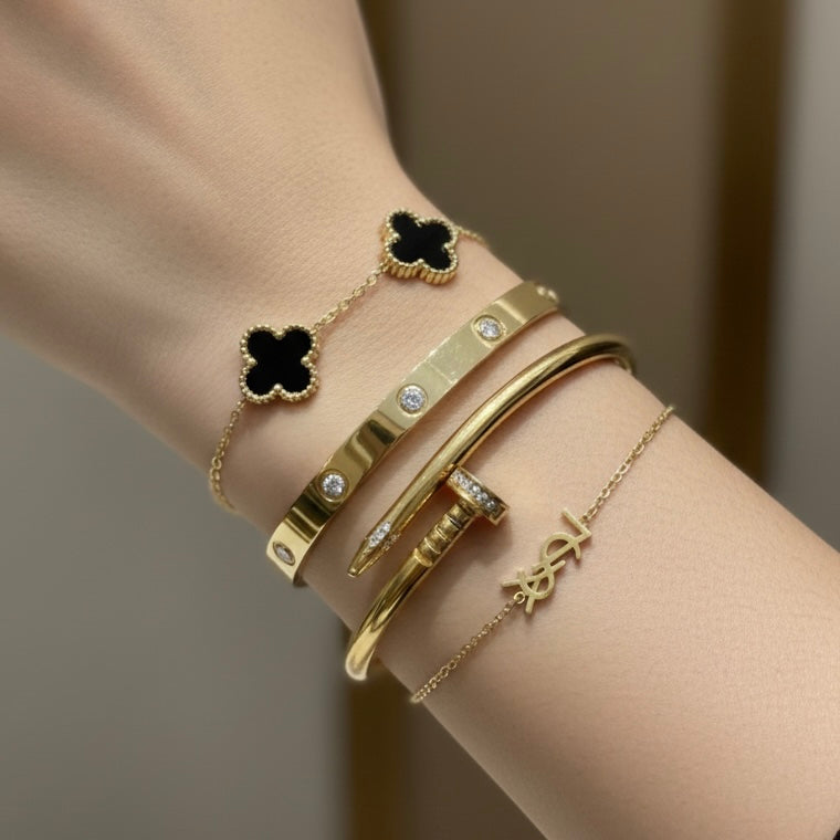 • سوار كارتيه (Love) كلاسيك: تصميم "سمبل" مصقول بعناية، يمنح المعصم ثباتاً وفخامة كلاسيكية لا تنتهي.